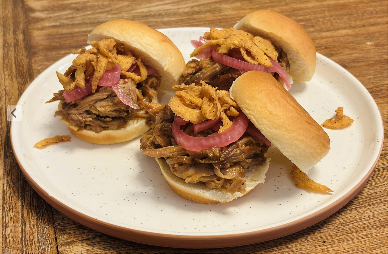 BBQ pulled pork slathered with OohNami! Sweet Chili Mustard Sauce and topped with pickled red onions and crispy jalapenos - all on toasted Hawaiian rolls.